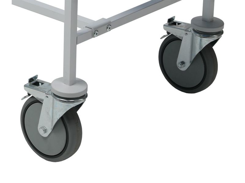 - Колеса поворотные, самоориентирующиеся, ∅ 200 мм, из немаркой серой резины, не оставляющего следов на полу, два колеса – с индивидуальным тормозным устройством